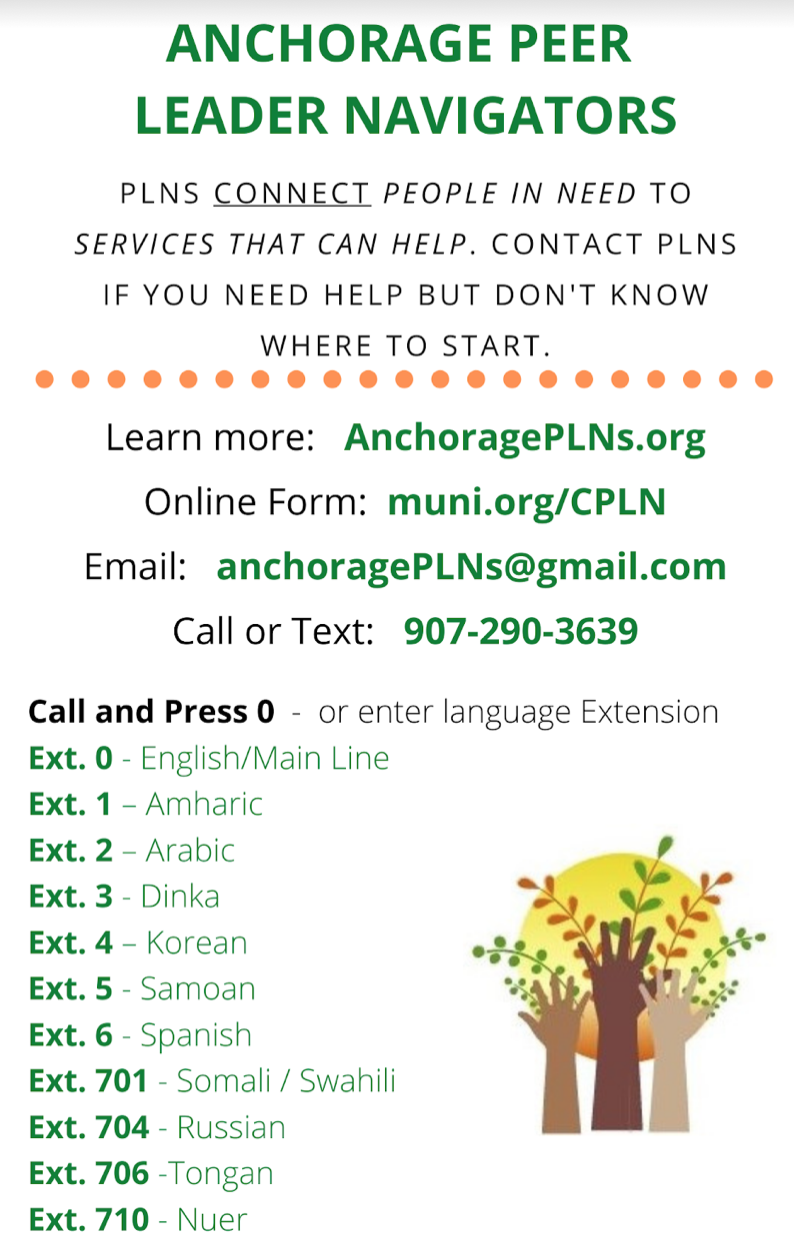 Anchorage Peer Leader Navigators (PLNs) are bilingual and multilingual people in Anchorage who have been trained to find and evaluate reliable information. They help people find the services they need. This can include, but is not limited to, help with navigating the healthcare system, finding reliable health information, and making vaccine appointments.